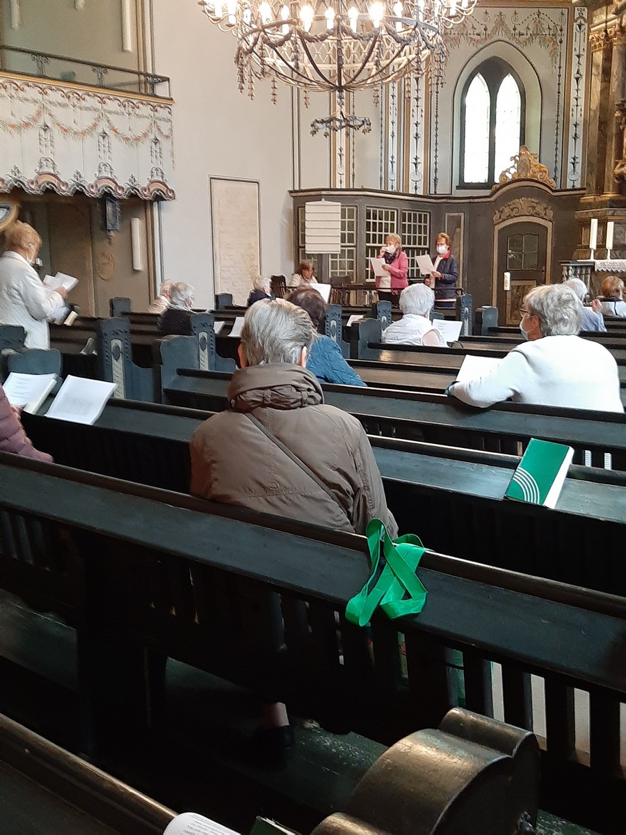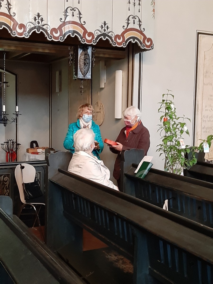 Der Mai rückte näher und wir fragten uns, was aus der geplanten Geburtstagsparty für unsere Singkreisleiterin Gudrun in den Corona – Zeiten werden sollte. Zum Glück wurden die Kontaktbeschränkungen noch rechtzeitig etwas gelockert und ein Vorbereitungskomitee ( Roswita, Bärbel, Heidrun, Ilse und wahrscheinlich noch weitere Lerchen) machten sich sofort an die Arbeit. Die Pfarrerin der Kirche in Petershagen genehmigte uns, die Veranstaltung dort durchzuführen. Die Singkreis – Damen und der Männerchor 1877 Eiche wurden informiert, ein Programm vorbereitet, Blumen und Geschenke besorgt.